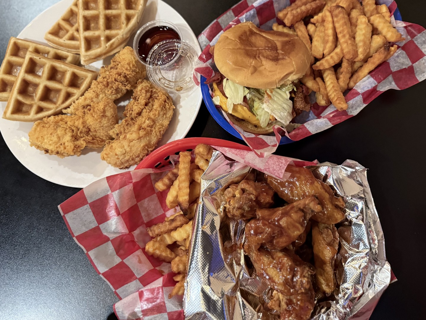 This local restaurant features delicious chicken and waffles. In addition to their signature dish, they also serve salads, burgers, fish, and more!