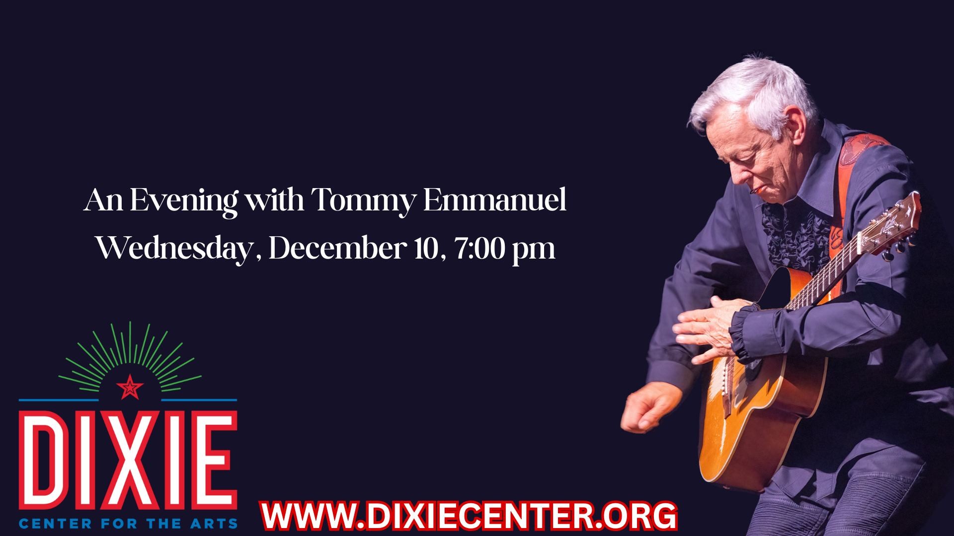 Three-time nominated and Grammy Award Winner Tommy Emmanuel C.G.P. is returning for his second appearance to the Dixie Center for the Arts in Downtown Ruston. Recognized as the elite of the elite and arguably the greatest living acoustic guitar player, Emmanuel has mesmerized both fellow musicians and audiences alike with a professional career that spans nearly seven decades. Emmanuel's dazzling performance, flawless guitar skills, and voluminous repertoire never fail to amaze and engage his legions. From the wilds of Australia's outback to bustling major cities throughout the world, Emmanuel's flair, unforgettable showmanship, and exhaustive worldwide touring schedule have created an enviable fan base that continues to grow even larger every year.