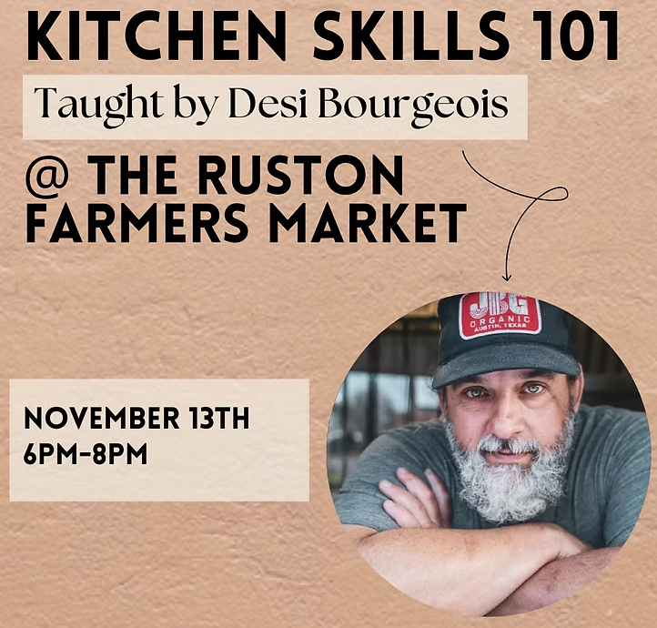 Join the Ruston Farmers Market for an unforgettable experience in this Kitchen 101 class. Teaching this class is Chef Desi Bourgeois, recently recognized as one of "The Top 10 Chefs to Watch" by Louisiana Cooking Magazine, this class is your gateway to mastering essential kitchen skills. In Kitchen Skills 101 you'll learn fundamental techniques and insider tips to elevate your kitchen experience.