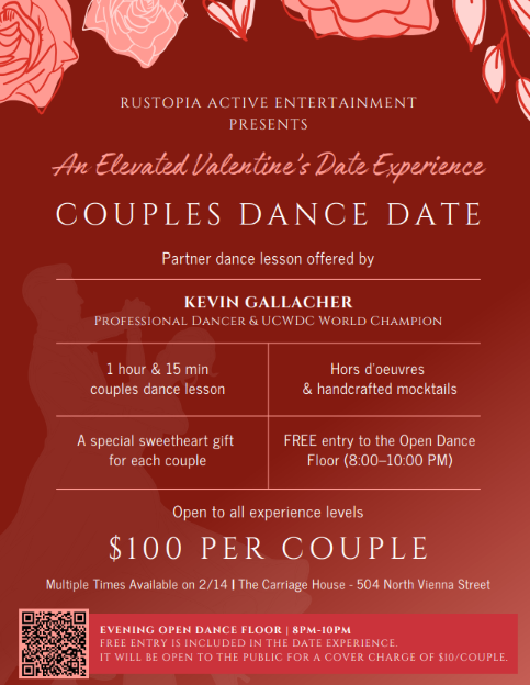 Rustopia Active Entertainment presents: An Elevated Valentine's Date Experience. This partner dance lesson is offered by Kevin Gallacher, professional dancer and United Country Western Dance Council (UCWDC) World Champion. This experience includes 1 hour and 15 minute couples dance lesson, hors d'oeuvres, handcrafted mocktails, and a special sweetheart gift for each couple. This will also give you free access to the open dance floor happening from 8-10pm.